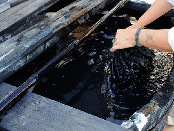 白族扎染的染料來自蒼山上生長的寥藍、板藍根、艾蒿等天然植物。用得最多的是板藍根,以前用來染布的板藍根都是山上野生的,多年生草本,開粉色小花,后來用量大了,染布的人家就在山上自己種植,好的可長到半人高,每年三四月間收割下來,在松木桶中漚制成染料。