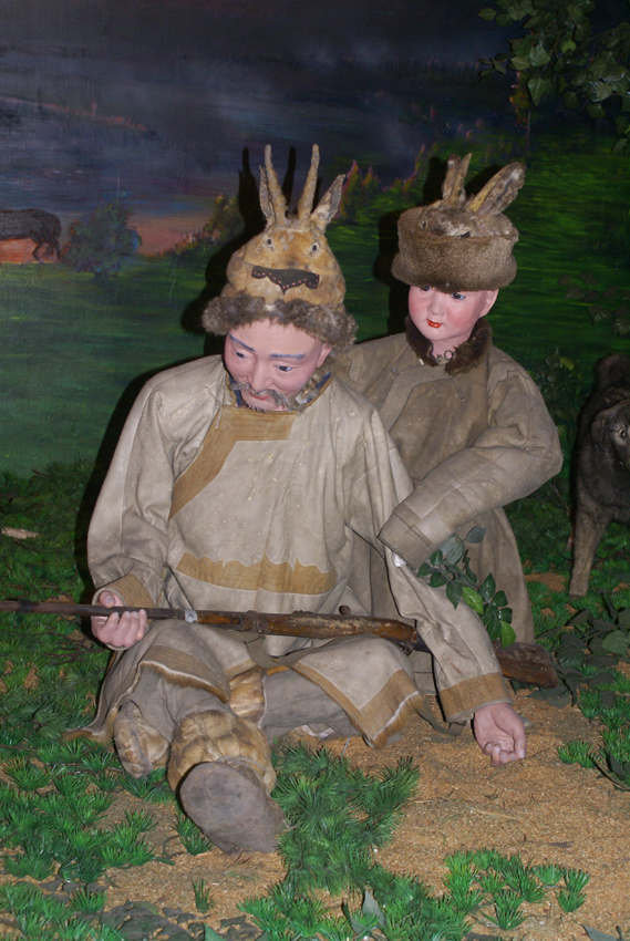 狩獵經(jīng)濟(jì)在鄂倫春族社會(huì)中維持了幾千年,一人一匹獵馬一桿槍,再加上幾條獵狗和一片獵場(chǎng),幾乎就是鄂倫春族的全部生產(chǎn)力。而槍支的傳入也不過才300多年的歷史,在此之前使用石塊和木棒狩獵,后來發(fā)明了扎槍和弓箭,與外界幾乎隔絕,純粹的食獸肉、衣獸皮。鄂倫春族最早使用的獵槍是被稱做“俄羅斯鳥槍”的火槍,這是清朝的察邊官吏、外民族及俄國商人交換給他們的。有火繩槍、火鐮槍和泡子槍三種,都是從槍筒裝入火藥或鉛彈,只是引爆方式不同。民國以后陸續(xù)傳入俄國造的連珠式和“三八”式、“七九”式等現(xiàn)代步槍。槍支的傳入,使鄂倫春人有了剩余產(chǎn)品,于是出現(xiàn)了交換經(jīng)濟(jì)。每年五月的“楚勒罕”集會(huì)時(shí),鄂倫春、鄂溫克、達(dá)斡爾等狩獵民族要向清廷貢貂,經(jīng)朝廷官員檢驗(yàn),不合格者可以在集會(huì)上進(jìn)行互市。此時(shí),他們也帶一些其他的獵產(chǎn)品及手工藝品進(jìn)行交換。由于鄂倫春人所貢貂皮質(zhì)量最好,故朝廷對(duì)他們采取了特別的納貂辦法:每年派一名專職人員到鄂倫春地區(qū)代表官府征收貂皮、發(fā)放賞賜。這些專職人員被稱為“諳達(dá)”,他們代表官府征收貂皮的同時(shí),也自帶一些糧食、布匹和其他生產(chǎn)、生活用品與鄂倫春人進(jìn)行私下交換。后來,“諳達(dá)”變成了泛指進(jìn)山進(jìn)行獵產(chǎn)品收購生意的所有商人?!爸O達(dá)”與鄂倫春人進(jìn)行交換時(shí)從不計(jì)價(jià),而是以“馬馱”為計(jì)量單位,雙方以同樣一馬馱的物品進(jìn)行互換,或者采取包干制的辦法,一個(gè)“諳達(dá)”固定幾個(gè)包攬戶,按期供給他們生產(chǎn)和生活必需品,包攬戶將所有的剩余產(chǎn)品交于“諳達(dá)”。隨著貨幣經(jīng)濟(jì)的發(fā)展,清末時(shí)期,鄂倫春族周邊地區(qū)出現(xiàn)了眾多商號(hào)商鋪,這些商號(hào)(鋪)的老板被稱為“老客”,他們同鄂倫春人進(jìn)行計(jì)價(jià)交換。同時(shí)還出現(xiàn)了一些進(jìn)行計(jì)價(jià)交換的行商,被稱為“跑老客”。鄂倫春人雖然受到“諳達(dá)”、老客和跑老客的瘋狂欺詐和層層盤剝,但在與他們的交換中,卻自覺或不自覺地打開了封閉的自然經(jīng)濟(jì)大門,朝著商品經(jīng)濟(jì)邁進(jìn)了一步(鄂倫春博物館展覽攝影:劉軍)。