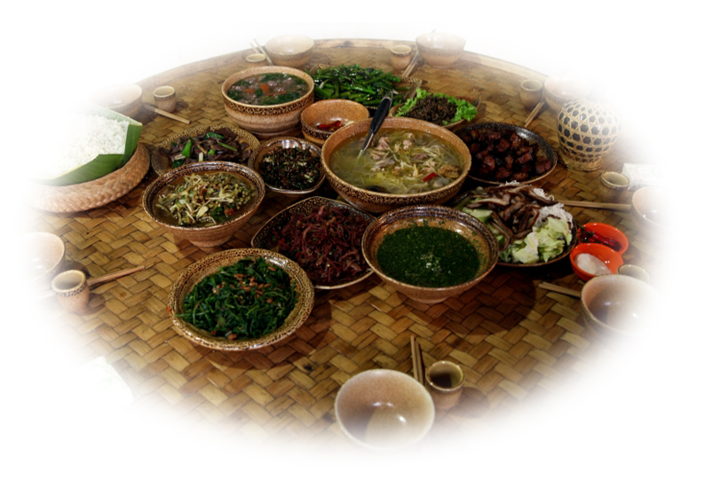德昂族絕大多數(shù)以大米為主食,部分地區(qū)雜以包谷和薯類。均以蒸燜而食,擅長制作各種糧食制品,如:豌豆粉、豆腐、米粉、年糕、粑粑、湯圓等。蔬菜種類繁多,竹筍是四季不斷的蔬菜之一,除鮮吃外,多加工成酸筍或干筍食用。其他蔬菜的食用,都習慣于在煮燉時配酸筍,或加油、豆豉、鹽成雜熬菜。酸筍用途十分廣泛,即使在燉雞、炒肉或烹魚時都要加酸筍調(diào)味。受當?shù)貪h族的影響,許多漢族風味的腌菜、腐鹵也是德昂族餐桌上常見的小菜。德昂族民間制陶和使用竹編制品歷史悠久,所有炊餐用具,大都是自制的陶器和竹器。