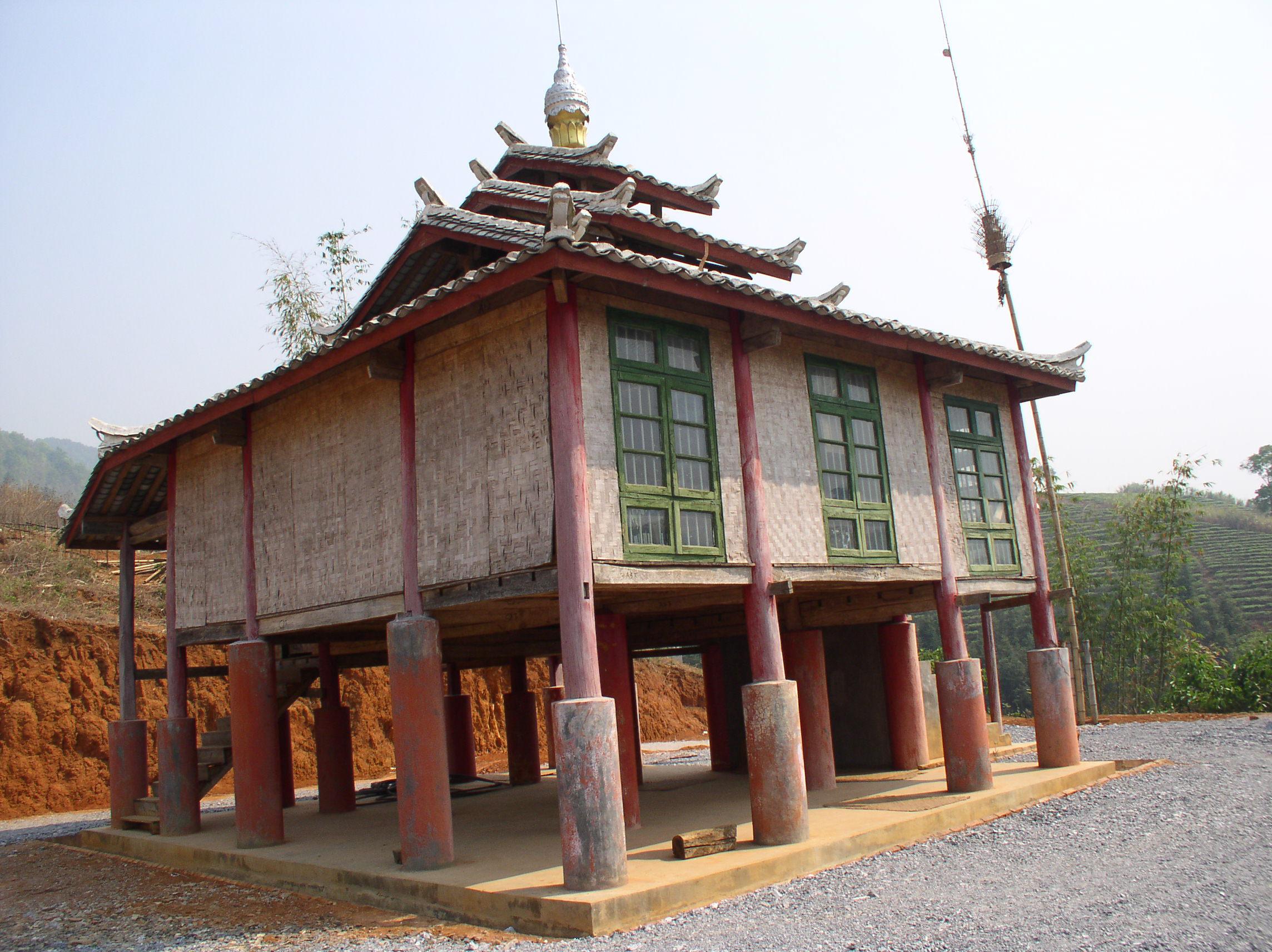 德昂族的家庭民居多為竹木結(jié)構(gòu)、歇山式草頂?shù)母蓹诮ㄖ?,平面有長(zhǎng)方形、半圓形、弧形等多種風(fēng)格。干欄式民居分上下兩層,上層住人、下層作畜廄,有主副兩座樓梯。歇山式草頂為圓弧形的民居,當(dāng)?shù)胤Q“氈帽形”,風(fēng)格粗獷。民居構(gòu)架為穿斗式木梁柱,樓面、隔間均用竹片或木板鋪設(shè)。在德宏等地是一家一院,主房樓上住人、煮食、貯藏糧食,樓下關(guān)牲口;附房用作堆放柴草和安裝舂米用的腳碓。鎮(zhèn)康地區(qū)若干小家庭同住一幢房子,房?jī)?nèi)中間有寬敞的走道,兩旁為各小家庭住室,間壁而居,各有火塘,所以竹樓較大,有的占地近400平方米。20世紀(jì)50年代以后,這種竹樓建筑已有改變,現(xiàn)在部分德昂族的住宅與附近漢族的平房一樣。德昂族信仰佛教,有些村莊里建有寺廟,每逢佛事活動(dòng)人們就來到寺廟里,舉行隆重的儀式。