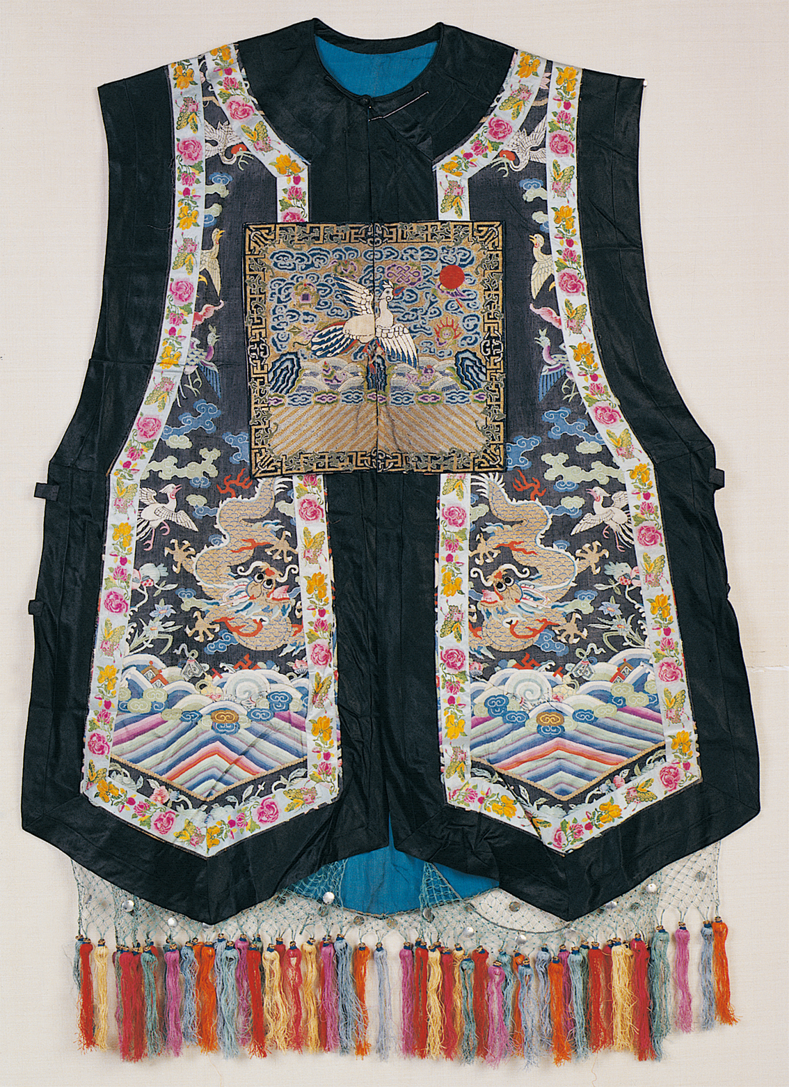 《史記·五帝本紀(jì)》載:“黃帝之前,未有衣裳屋宇。及黃帝造屋宇,制衣服,營殯葬,萬民故免存亡之難?!痹谖迩Ф嗄昵暗男率鲿r代仰韶文化時期,可能就產(chǎn)生了原始的農(nóng)業(yè)和紡織業(yè),開始用織成的麻布來做衣服。據(jù)傳,黃帝之妻嫘祖發(fā)明了飼蠶和絲紡,衣冠服飾基本成制。殷商西周,冠服制度逐漸完善,春秋戰(zhàn)國時期,衣冠款式走向多元,冠服制被納入“禮治”范疇,從此漢族衣冠服制更加詳備。中原地區(qū)還出現(xiàn)了胡服戎裝,甚至相沿成風(fēng)(圖為漢族清代七品文官女朝褂,中央民族大學(xué)民族博物館館藏)。