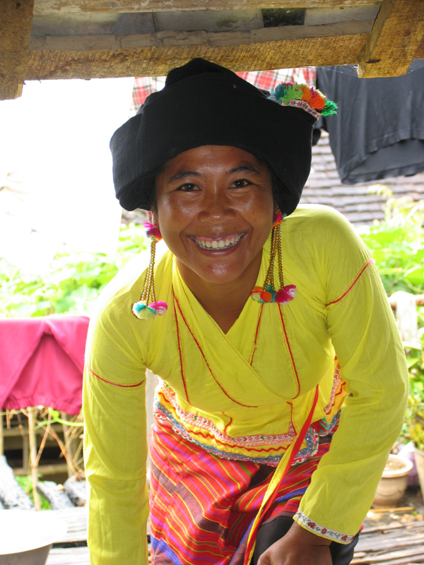 婦女的衣裙與傣族相似,上穿緊身短衣,頭頂挽髻,用頭巾纏頭,喜歡戴大耳環(huán)、銀手鐲等裝飾。姑娘愛戴野花或自編的彩花,將雙頰染紅。一般,女子上著左右兩祚斜襟窄袖黑色小褂,小褂為圓領、緊腰、寬擺,短及臀部,在左肋下拴線打結,已婚婦女用黑色布料,未婚姑娘喜淺藍色或白色。里衫為無袖貼身夾衫,下穿兩條筒裙,內裙為白色,外裙有兩色,臀部以上為紅色橫條,腿下為綠色或黑色,用布條或花邊鑲飾。未婚婦女用黑或藍布包頭;已婚婦女梳發(fā)髻,插銀簪,頂端鑲3顆棱形玻璃珠,下系銀鏈,纏包頭。婦女戴銀耳環(huán)、項圈、手鐲等飾品。