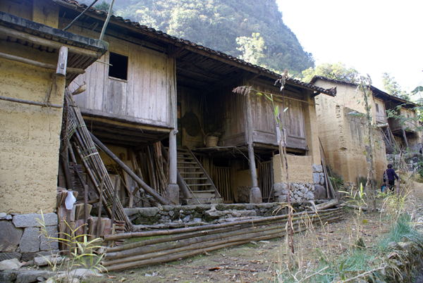 干欄石屋(亦稱干欄石樓)為進(jìn)入20世紀(jì)后多數(shù)農(nóng)民的住屋,是凹形矮腳石木結(jié)構(gòu)干欄式,因墻基用石頭砌成而得名。上層住人,下層圈養(yǎng)牲畜及堆放農(nóng)具和柴草,可以防潮。整棟房為石基、泥墻、木柱、瓦頂。每棟以用銜條數(shù)和間數(shù)多少區(qū)別大小。從屋頂?shù)轿蓍軆蛇?,?3根銜條的叫檐十三,用15根的叫檐十五,以此類推。檐十三屋內(nèi)較窄,不便擺放家具雜物;檐十九較寬敞,但屋檐低矮,室內(nèi)陰暗。以檐十七居多,屋里寬敞,通風(fēng)采光也良好。多為三、五、七、九間,大門居中,兩邊對稱。