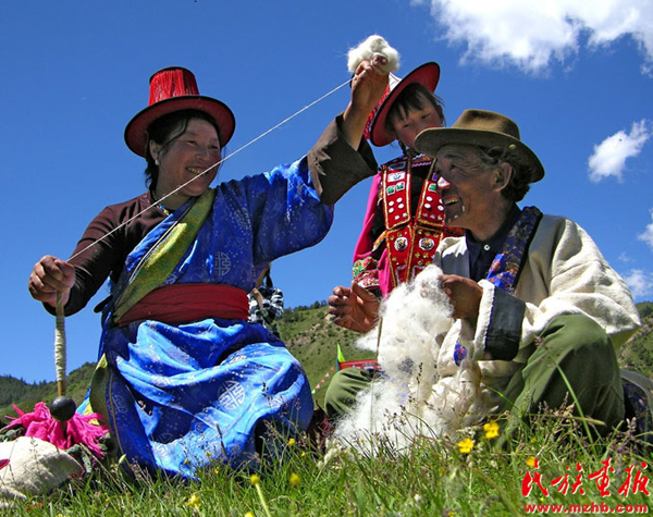 在放牧?xí)r裕固人常常捻羊毛。 央金 攝影 引自民族畫報