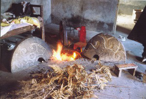 涼山彝族獨特的“鍋莊石” 。彝族的火塘為全家的生活中心,進(jìn)食、取暖、照明、會客、議事等都圍著火塘進(jìn)行?!板伹f”由3塊石頭支撐,一般在房屋建成前就請石匠打造好鍋莊石。其石料選取沒有污垢而又無缺陷的青石,鑿成厚10厘米左右的變異扇形,上面刻有龍、火、日、月、魚、鳳等古樸傳神的浮雕圖案。日常生活中,一般在鍋莊“上方”(火塘里側(cè)至墻壁)設(shè)矮床。