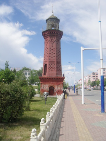 雙塔,距紅樓不遠(yuǎn),是于19世紀(jì)末和20世紀(jì)初兩名烏孜別克族商人捐建的“宣禮塔”。雙塔呈鐵紅色,造型峻拔,塔身上的磚雕,菱形、圓形、六角星圖案美感別具風(fēng)味,圓形琉璃的塔頂,亮如翡翠,通過塔座上的小木門可登上塔頂。這座雙塔體現(xiàn)了典型的俄羅斯建筑風(fēng)格。