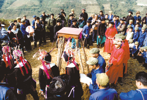 寨子里響起了鞭炮聲,整個(gè)寨子都熱鬧起來(lái)。師父?jìng)儙е智巴茏蛹抑鞒謨x式。即將受戒的十多個(gè)男孩分坐兩排,前排的用被子蒙著頭,后排的帶著草帽,不讓人看見他們的臉。在歌手的歌聲和樂(lè)聲中,開始了一項(xiàng)項(xiàng)受戒儀式。從天明到黑夜都在不停地進(jìn)行著。