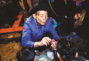 這天,我們剛好在縣里采訪,聽說(shuō)高良鄉(xiāng)瑤族村寨要舉行度戒活動(dòng),于是就直奔瑤寨而去。一進(jìn)寨子,馬上感覺(jué)氣氛不同。瑤族婦女們頭戴別致的大銀盤,身著盛裝,真像過(guò)節(jié)一樣。經(jīng)了解后,得知寨子里共有十幾個(gè)男孩要參加這次度戒。寨子里的一位老人告訴我們,一般情況下,只是兩三人,這樣多的男孩一同舉行度戒儀式是很難碰到的??磥?lái),我們的運(yùn)氣還真不錯(cuò)。我們來(lái)到度戒地點(diǎn),見到將要度戒的十幾個(gè)男孩集中在一起,用棉被蒙著頭,不能見陽(yáng)光,要等儀式完后,才能見陽(yáng)光。
