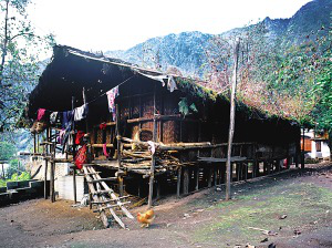 在怒江上游峽谷聚居的傈僳村寨都建在高山的半山上,其民居俗稱為“千腳落地房”。說“千腳落地”雖有些夸張,但也足以形象地說明峽谷溫?zé)岬臍夂蚝蜕礁咂露傅牡乩項(xiàng)l件。在雨季時,“千腳”阻力最小,使山洪順利傾瀉而下,又很快干爽,免受潮氣。而且不需挖地動土,不必移石砌墻,對木料沒有過高要求,長短皆用,在生態(tài)脆弱的高山峽谷也算環(huán)保建筑?!扒_落地”是因建房時先在確定的屋基上依斜坡程度和住房面積打進(jìn)數(shù)十根到百余根木樁為基樁,以保證居室樓板的平正。基樁打好后,除四面留幾根高柱作為整個房屋的立柱外,在密集木樁所形成的平面上滿鋪竹篾編織的樓板,還有竹篾圍墻,所有結(jié)構(gòu)皆用竹篾綁扎。屋頂鋪苫草或蓋木片瓦,近幾年,已陸續(xù)換上了大塊的水泥波形瓦。房門開在山墻一側(cè),有廊道,可做曬臺,平時穿的衣服都搭在這兒,也是婦女做針線活的地方。隨著怒江峽谷的開發(fā)和新農(nóng)村建設(shè)的深入,通路的村寨將很快會改變面貌。