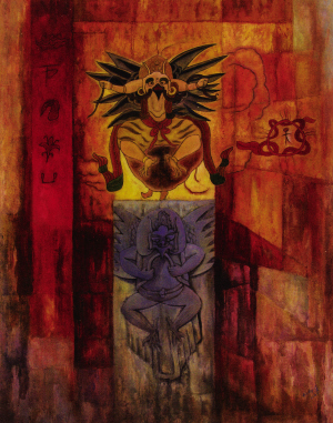 我以前所結(jié)識的一批納西族畫家差不多都是上世紀(jì)四五十年代出生的,他們大多接受過美院等高等藝術(shù)院校的教育,具有堅(jiān)實(shí)的繪畫功力,有相同的美學(xué)見解和共同的探索形成的藝術(shù)追求。它一出現(xiàn)就以其獨(dú)特的美學(xué)傾向和特殊的藝術(shù)魅力引起世人的關(guān)注。而和向東是上世紀(jì)70年代出生的青年畫家,他原來就讀于浙江大學(xué)的藝術(shù)設(shè)計(jì)專業(yè),只因迷上美術(shù)學(xué)理論而走上了創(chuàng)作之路,沒有學(xué)院派的背景。他的家鄉(xiāng)云南麗江現(xiàn)在已是聲名鵲起,納西族東巴文化作為世界記憶遺產(chǎn)已聞名海內(nèi)外。作為年輕一代的納西族畫家又該怎么表現(xiàn)東巴文化呢?這個(gè)學(xué)藝術(shù)設(shè)計(jì)的年輕人以設(shè)計(jì)師的獨(dú)特眼光和思維,一開始就與“現(xiàn)代東巴繪畫派”的中年畫家群體拉開了距離。其作品在保留古老的東巴繪畫藝術(shù)的基礎(chǔ)上,在作品中運(yùn)用書寫東巴經(jīng)卷的各種形象和文字符號。用當(dāng)代人的思維觀念和審美意識,運(yùn)用油畫的技法來表達(dá)。畫面大多用平面設(shè)計(jì)的構(gòu)成原理,以裝飾性的、形式感極強(qiáng)的、既寫實(shí)又抽象的手法表現(xiàn)出原汁原味的納西文化。即使拋開作品主題內(nèi)涵,依然可以從他的作品里感受到一種神秘、古樸、深沉的歷史基調(diào)。因4年前他的創(chuàng)作是在平面設(shè)計(jì)為主的業(yè)余時(shí)間里完成的,而真正投入精力進(jìn)行專業(yè)創(chuàng)作是近兩年的事,因此,他現(xiàn)在處于學(xué)習(xí)、吸收、探索創(chuàng)作的過程中。