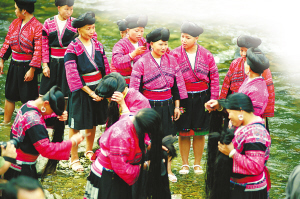 紅瑤女子的長(zhǎng)發(fā)平均在1.4米以上。村寨前后的河灘邊、泉水邊,就是她們的天然梳妝臺(tái)