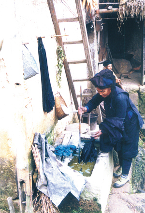 紡紗、織布、藍(lán)染,是哈尼族婦女制作服裝的重要組成部分。她們在織布前要做的準(zhǔn)備工作,就是操動制線機(jī),把一根根短小的線連接起來,捲在小木棍上,然后操動絞線機(jī),把線棍上的線分開絞在木梭子和木輪子上。接著是分線,人數(shù)不限,但不能少于5人,一般10米為一組線。織布時,在織布機(jī)上方搭起兩排密集的線網(wǎng),當(dāng)雙腳踩動踏板時,兩排線網(wǎng)一上一下地交叉移動,將拖著線的梭子一次次地左右穿梭于線網(wǎng)中。這樣重復(fù)地進(jìn)行,就織出一筒筒布,一般10米為一筒布。最后把織成的布放入靛缸里泡洗,曬干后就可以制作服裝了。
