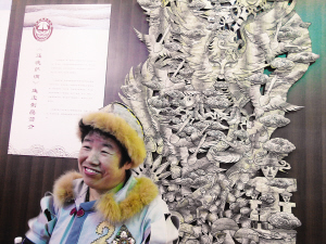 在展廳里,幾位來自黑龍江的手工藝人還現(xiàn)場(chǎng)展示了魚皮制作技藝。64歲的劉升從事魚皮制作已近20年,被評(píng)為黑龍江省工藝美術(shù)大師。她告訴記者,赫哲族過去主要用魚皮制作衣服,現(xiàn)在則用魚皮制作各種工藝品、小掛飾。在她身后,掛著一張長(zhǎng)兩米多、寬約1.5米的魚皮畫《還魂薩滿》,展示了赫哲族神話傳說中的圖景,有薩滿、有森林、大鳥和各種圖騰,充滿了原始而神秘的氣息。劉升說,這還只是未完成的作品,但已用了3000多張大馬哈魚皮。