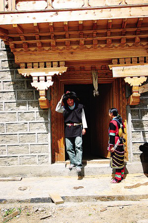 在珞巴族家中,男主外,女主內(nèi),分工相當(dāng)明確。當(dāng)達(dá)瓦在家里和我聊天時,他的妻子群宗一直在忙碌著,忙著給我打酥油茶,忙著生火燒水、煮土豆,忙著照顧孩子。為了讓我能拍一張達(dá)瓦一家人穿珞巴族服裝的照片,大家費(fèi)了好大勁兒。他們從東家借來帽子,從西家找來褂子,也有從南家借來的飾品……終于,達(dá)瓦和群宗夫妻倆都穿戴上了本民族的服飾,我如愿以償?shù)亟o他們拍了一張全家福。
