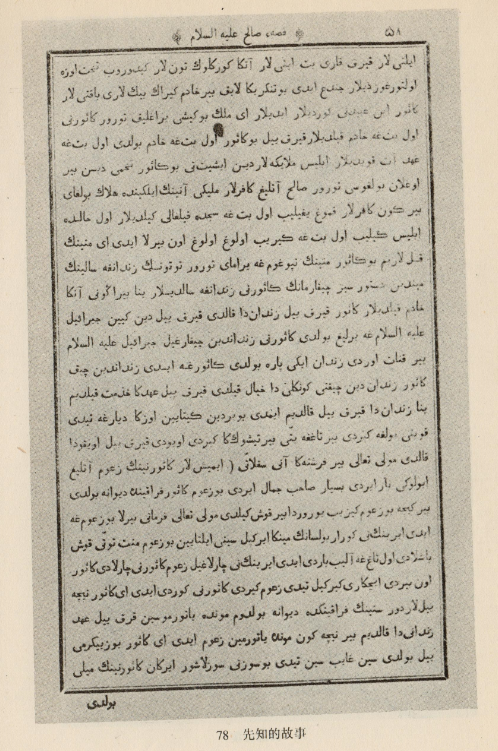 察合臺文著作。1899年喀山大學(xué)鉛印本。高25.5厘米,寬17.5厘米,共510頁。作者拉布古孜,寫于14世紀(jì)。圖為《先知薩立哈故事》中的一頁。寫的是異教徒們在魔鬼的支使下將要成為先知薩立哈的父親卡斯瓦爾關(guān)進地牢,天使奉真主之命使他逃出后與妻子見面的故事?,F(xiàn)藏新疆博物館。該書語言豐富生動,屬哈喀尼耶語(后期回鶻語)和察合臺語之間的過渡語言,一定程度上反映了當(dāng)時的口語,是研究維吾爾語言史和文學(xué)史的重要資料。