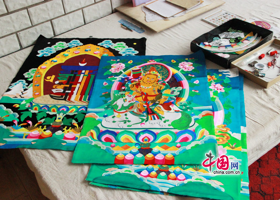 堆繡的工序一般有圖案設(shè)計、剪裁、堆貼、繡制,個別圖案部分上色等。堆繡先按規(guī)范的佛畫繪成畫稿,再按佛像不同部位的要求選用各色面料,剪貼縫制而成。小幅畫面為一尊主佛像與下方兩尊小佛像組成,周圍配以花卉、云紋、日月、供品等圖案。與傳統(tǒng)的唐卡不同,堆繡工藝品是用各色棉布、綢、緞剪成所設(shè)計的各種圖案形狀,精心堆貼成一個完整的畫面。其工序有圖案設(shè)計、剪裁、堆貼及個別圖案部分上色等。一般來講,圖案設(shè)計環(huán)節(jié)主要以客人需求為主。勾草圖最能考量藝人繪畫技能,也是至關(guān)重要的步驟。圖案設(shè)計完成后,將各色布料比照圖案剪裁、粘好,之后再填充以羊毛或棉花等,以使圖案凸起,最后將各色布料圖案堆貼在設(shè)計好的大幅布幔上,構(gòu)成一組完整的畫面,達(dá)到靜中有動、生動傳神、惟妙惟肖的境地。使畫面產(chǎn)生豐富生動的立體感和織物特有的肌理感,達(dá)到淺浮雕式的藝術(shù)效果,表現(xiàn)力豐富。作品粗獷中顯細(xì)膩,點滴中見絕妙,技藝精湛,巧奪天工。一幅堆繡可以說是一幅絲質(zhì)的彩色浮雕作品,極具藝術(shù)觀賞價值。