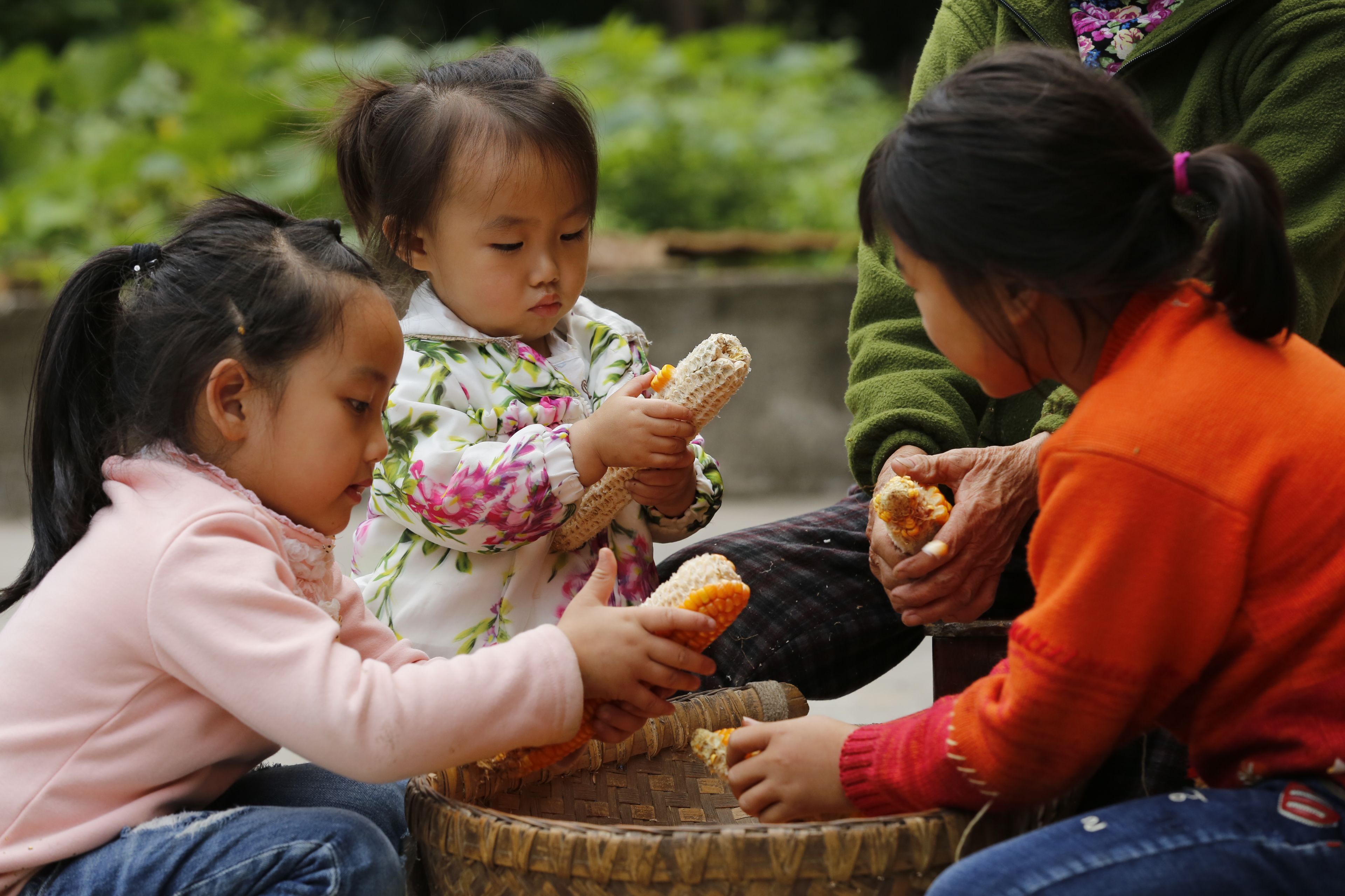 貴州貴陽(yáng)苗族日常生活-老年人與兒童剝玉米
