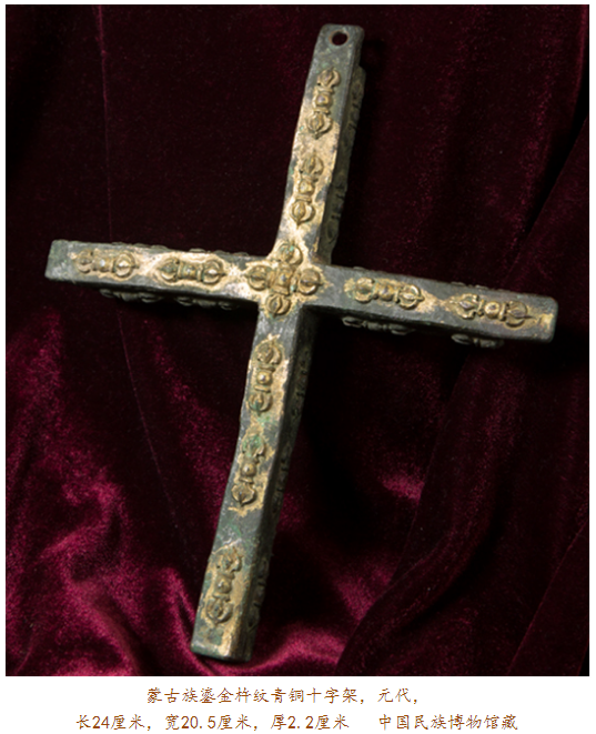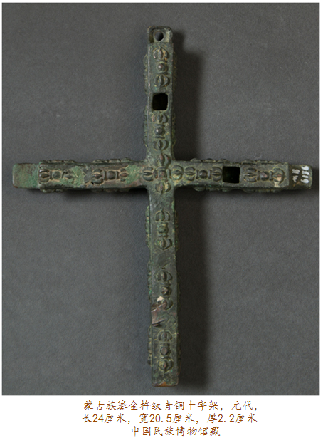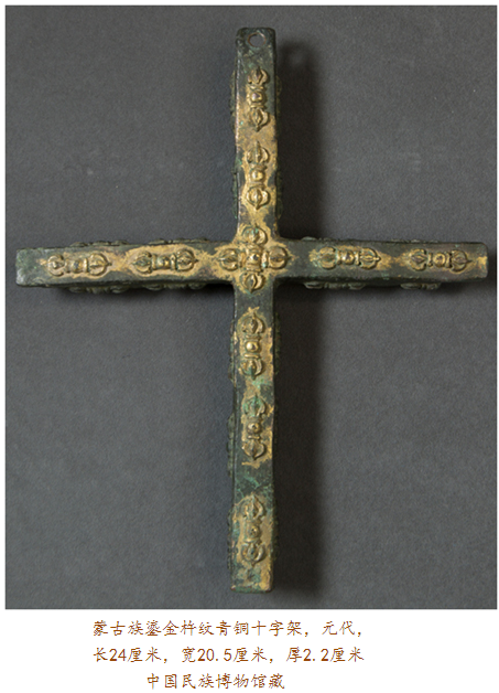 眼前此件在內(nèi)蒙古達(dá)茂旗出土的元代鎏金青銅十字架,四面排列有浮雕金剛杵紋,其正面每個(gè)金剛杵圖案上均有鎏金裝飾,十字架上部穿孔則可用于懸掛。金剛杵是藏傳佛教里的修行法器,象征力量與智慧;而十字架則是基督教文化的標(biāo)志,如此混搭,歷史便要傳遞出種種:在信仰藏傳佛教的蒙古高原,金剛杵,象征無畏圓滿,十字架,則代表救贖重生,東西方文化的結(jié)合亦呈現(xiàn)某種文明可能達(dá)到的無可比擬之高度。