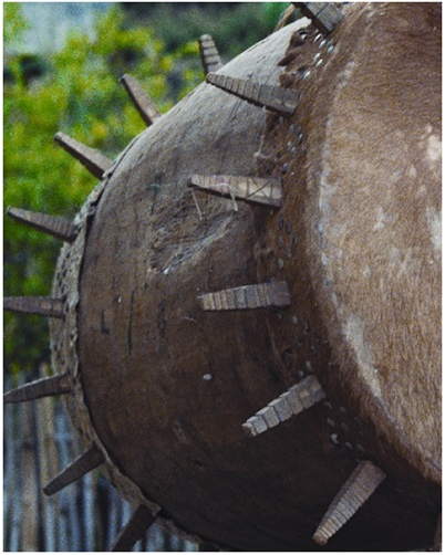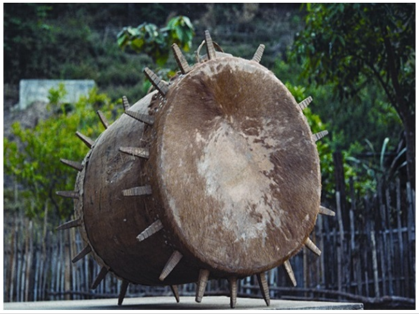 民族文化宮博物館藏基諾族木質(zhì)皮鼓,鼓面直徑55厘米,高88厘米,長(zhǎng)約130厘米,20世紀(jì)八十年代征集于云南省西雙版納州景洪縣基諾鄉(xiāng)。鼓身為木質(zhì),呈圓柱形,兩端對(duì)稱(chēng)。鼓有兩面,用牛皮蒙制。兩端鼓面邊緣各環(huán)繞嵌有花紋的上方下錐形的木棍(一側(cè)17根,另一側(cè)為20根),木棍長(zhǎng)15厘米。鼓身兩側(cè)有方形孔,為鼓的音孔,上部有兩個(gè)把手,用于系繩懸掛木鼓。因鼓面兩端邊沿嵌有數(shù)十根鼓釘,形似太陽(yáng)放射出的光芒,也稱(chēng)為“太陽(yáng)鼓”。