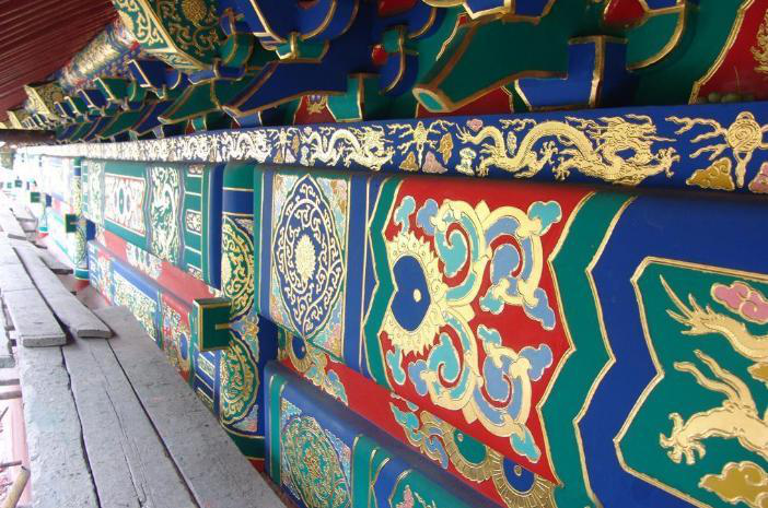彩畫(huà)著色是一項(xiàng)關(guān)鍵的工序,不能有半點(diǎn)差錯(cuò)。工匠們?yōu)椴煌伾O(shè)定了代號(hào),一米色、二淡青、三香色、四硝紅、五粉紫、六洋綠、七佛青、八石黃、九紫色、十黑煙、十一紅等。將代號(hào)直接寫(xiě)在地仗上,然后根據(jù)色號(hào)將各種色料對(duì)號(hào)入座,涂刷著色一、二遍,待干后再刷一遍光油罩光,以起保護(hù)作用。彩畫(huà)所用色料一般均為各色成品油漆。