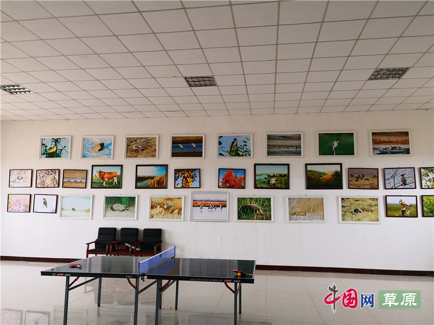 薩如拉圖雅嘎查農(nóng)牧民培訓(xùn)基地展廳,墻上掛滿了廷·巴特爾牧場(chǎng)野生動(dòng)植物攝影作品