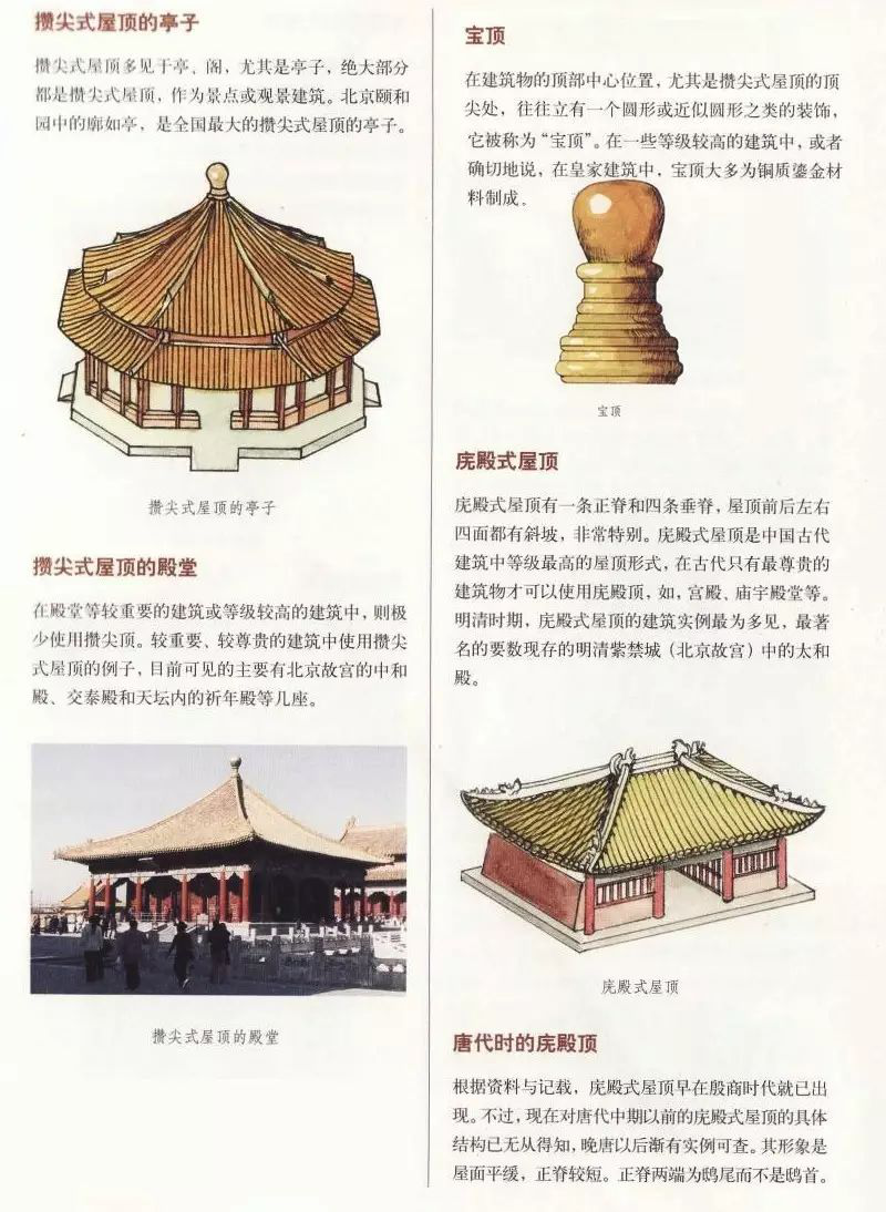 無正脊,只有垂脊,只應(yīng)用于面積不大的樓、閣、亭、塔等,平面多為正多邊形及圓形,頂部有寶頂。根據(jù)脊數(shù)多少,分三角攢尖頂、四角攢尖頂、六角攢尖頂、八角攢尖頂。此外,還有圓角攢尖頂,也就是無垂脊。攢尖頂多作為景點(diǎn)或景觀建筑,如頤和園的郭如亭、麗江黑龍?zhí)豆珗@等。在殿堂等較重要的建筑或等級(jí)較高的建筑中,極少使用攢尖頂,而故宮的中和殿、交泰殿和天壇內(nèi)的祈年殿等卻使用的是攢尖頂。攢尖頂有單檐、重檐之分。