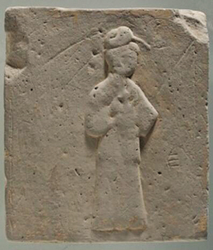 長30厘米,寬26.5厘米,厚4.5厘米,呈長方形。畫面中央刻有一位仕女形象。仕女儀態(tài)端莊,發(fā)髻高高盤起,衣著長裙,雙手抱著一個長柄執(zhí)壺,輕移蓮步,徐徐向前,像是要給遠(yuǎn)道而來的朋友斟上一杯家釀的美酒。
