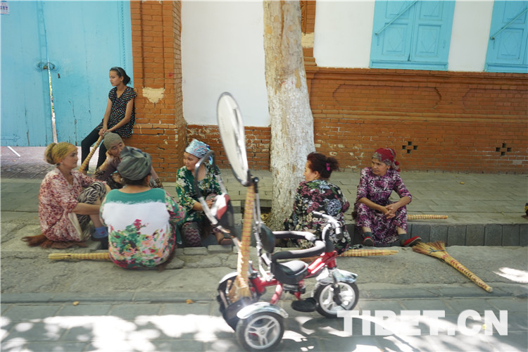 走在喀贊其街頭,可以看到穿著鮮艷花色連衣裙的維吾爾族婦女、扎著漂亮方形頭巾的哈薩克族姑娘、戴著白色圓帽的回族老漢……如同觀看一場民族服裝表演。圖為喀贊其老街上的“悠閑時光”。