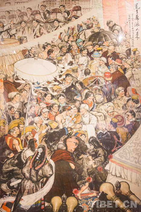 鑒賞展現(xiàn)場(chǎng),不少前來(lái)參觀的畫家都是韓書力的學(xué)生或在一定時(shí)期曾受其教導(dǎo)?!?973年,我在西藏自治區(qū)展覽館見到了韓書力老師,第一次見面我就拜了師。我們一起下鄉(xiāng),我就給他當(dāng)導(dǎo)游和翻譯。30幾年來(lái),我一直在學(xué)習(xí)韓老師的繪畫技法,到現(xiàn)在還是他的學(xué)生。韓老師創(chuàng)作《毛主席派人來(lái)》時(shí),我就跟在旁邊學(xué)習(xí)。學(xué)到了一些創(chuàng)作獨(dú)幅作品的技巧和手法,讓我受用至今?!蔽鞑厍嗄戤嫾矣?jì)美赤列說(shuō)。