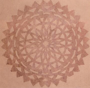 該剪紙出土于吐魯番市阿斯塔那303號(hào)墓,不僅保存完好,而且構(gòu)圖對(duì)稱、畫面均勻、線條流暢、美觀大方,可以和現(xiàn)代民間剪紙藝術(shù)相媲美。剪紙為圓形,呈土黃色,中心圖案為八角花形,依次向外為兩圈菱形花紋,交叉錯(cuò)落,排列有序;再向外圈為梯形紋組成的三角形邊飾。整個(gè)剪紙圖案層次分明,變化繁復(fù),頗有韻律感。這幅剪紙為折疊后一次剪成,造型簡潔,刀法洗練,具有古樸濃郁的民間風(fēng)格。