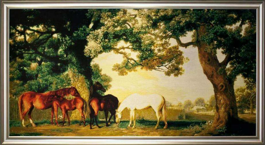 一般畫面較大,多數(shù)復(fù)制名畫、人物和風(fēng)景照片。用線顏色往往達(dá)數(shù)百種,特別強(qiáng)調(diào)色階、色相的過(guò)渡,并注重人物神態(tài)的刻畫。作品常作為大型建筑的室內(nèi)裝飾。