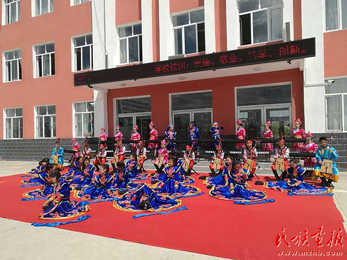 農(nóng)牧民的孩子們?cè)诩议T口的小學(xué)里也能接受到專業(yè)系統(tǒng)的藝術(shù)教育,圖為孩子們?cè)谶M(jìn)行才藝表演