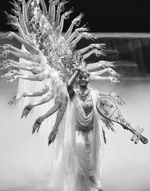 在敦煌舞的動(dòng)作素材積累方面,無(wú)論是對(duì)敦煌壁畫舞姿的歸類、整理,對(duì)“敦煌舞特有的S型曲線運(yùn)動(dòng)規(guī)律”的發(fā)現(xiàn),以及“運(yùn)用中國(guó)古典舞蹈的節(jié)奏韻律,把靜止的姿態(tài)與其風(fēng)格統(tǒng)一的動(dòng)作過(guò)程結(jié)合起來(lái),形成比較完整的舞蹈運(yùn)動(dòng)和造型體系”,還是在創(chuàng)作層面上《絲路花雨》對(duì)“反彈琵琶”典型壁畫舞姿的發(fā)展,《千手觀音》對(duì)“千手”舞姿造型的無(wú)限變化發(fā)展,以及《飛天》超越人體動(dòng)作范圍極限對(duì)“三道彎”典型敦煌舞姿風(fēng)格的強(qiáng)化等,都是敦煌舞在動(dòng)作素材層面的積極建設(shè)和發(fā)展。