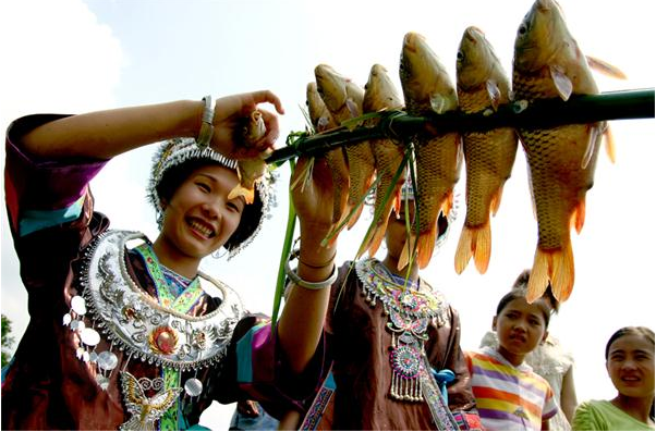 燒魚是廣西融水苗胞的習(xí)俗之一,融水的苗族同胞素有在稻田里養(yǎng)魚的習(xí)慣,每年春插,苗家人向來喜歡在稻田里放養(yǎng)鯉魚。每年的秋收稻黃時節(jié)也是田鯉肥壯之時,這時來自四鄉(xiāng)八寨眾多的各民族兄弟便匯聚起來,點燃一堆堆篝火,燒田鯉吃野餐,盡享豐收喜悅。燒魚從9月稻黃收割開始持續(xù)到12月底才正式結(jié)束,故名“元寶山金秋燒魚季”。燒魚季節(jié),苗寨家家戶戶釀起醇濃的甜酒,蒸著香噴噴的糯米飯,帶上食鹽、辣椒、蒜苗、蔥花、薄荷等佐料上山去剪禾。晌午時候,他們在田頭或田邊的平地?zé)鹨欢讯洋艋穑瑥奶锢镒硪换\籠活蹦亂跳的鯉魚,用樹枝或竹片把魚一條條串起,排成一排,然后放在紅彤彤的火炭上翻來覆去地烤,大約半小時左右,魚被烤炙得“呲呲”作響,水分烤干,慢慢地變黃,直至熟透,香飄四溢,遠遠就可聞到香味。