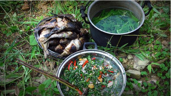 打魚湯也獨具特點,先用缽頭盛好冷水,放入佐料和魚仔,再把洗凈的鵝卵石放進火炭中燒的通紅,然后放進缽里,反復(fù)多次,直至把魚湯燒開,魚仔和佐料燒熟,味道特別新鮮可口。