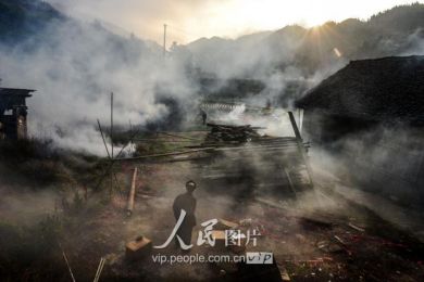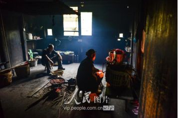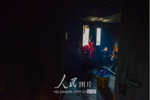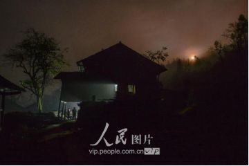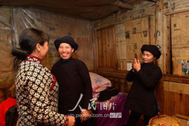 一般要到快過春節(jié)的時候,男方家才專門請人去接女方來洗糯米、打糍粑,新娘方能在夫家住上一夜;在來年農(nóng)忙時節(jié),又接女方來幫忙,夜里仍不能在男方家留宿,幫完忙當(dāng)晚即回去,只有待到女方有身孕后,新娘才到夫家長住。圖為11月16日夜,新娘潘芝銀家為準備婚禮,燈火徹夜長明。