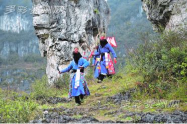 地戲演員利用勞作空閑時間在山間排練地戲。