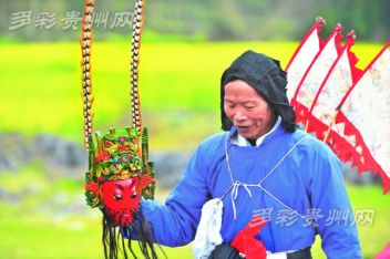 安順地戲的顯著特點是演出者頭蒙青巾,腰圍戰(zhàn)裙,戴假面于額前,手執(zhí)戈矛刀戟之屬,隨口而唱,應(yīng)聲而舞。