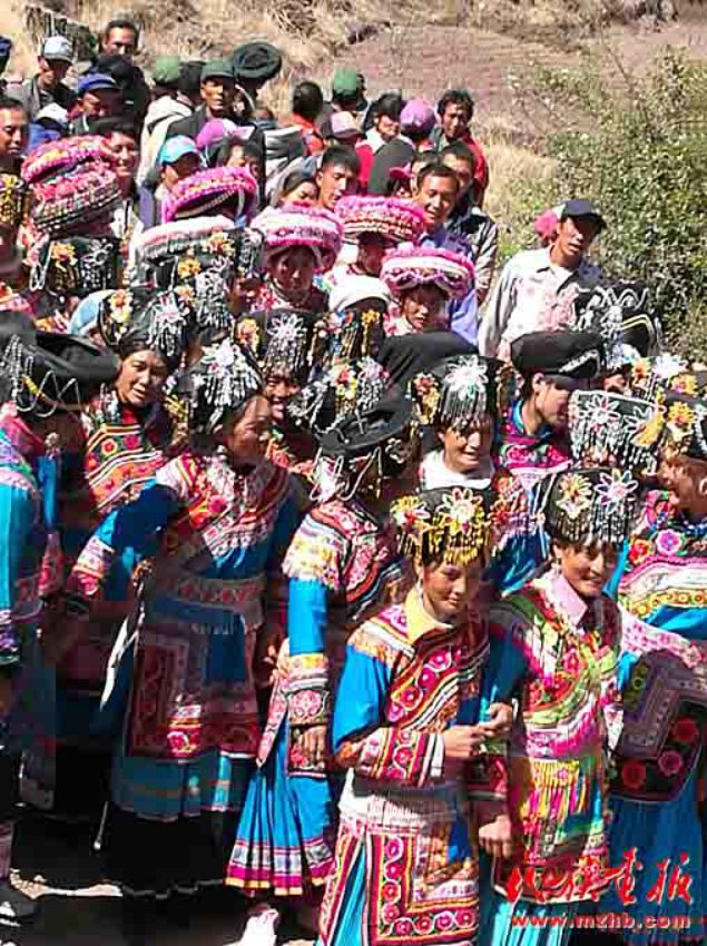娶親要請(qǐng)客,當(dāng)?shù)乩圩逭?qǐng)客只需口頭傳話,凡是知道的親戚朋友都會(huì)來(lái)參加。娶親隊(duì)伍主次兩位主婚人,伴郎伴娘各一人,背新娘和嫁妝的二人,接親的四至六人,其中有一至兩個(gè)歌手,一行十二人組成。帶著早已為新娘準(zhǔn)備好的花短衣、長(zhǎng)裙、銀手飾、圍腰鏈、銀泡、銀項(xiàng)等飾物興高采烈地從新郎家出發(fā)。