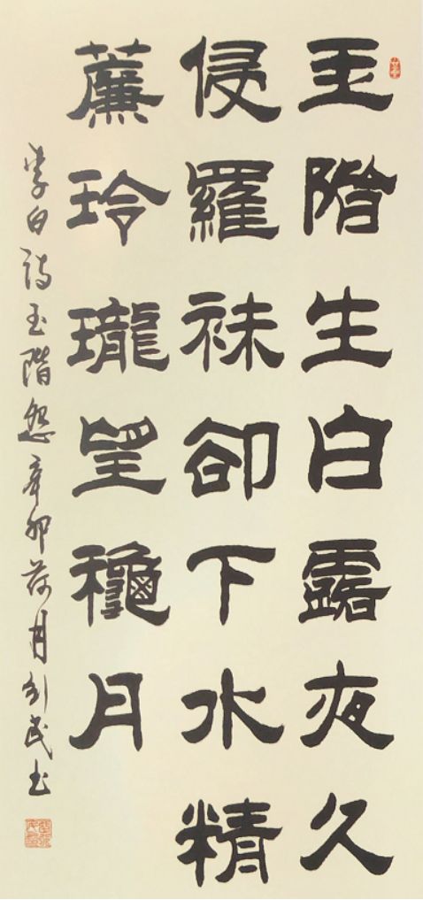 張行民的書法作品博覽眾家之長,悉心揣摩隸書之要義,領(lǐng)悟其精髓,加入其心志與感悟,漸漸形成了自己的風(fēng)格。他的作品灑脫飄逸,體骨厚重,參合有各派書體的筆意,同時又有自己個性和意境的張揚,字體端莊英武,體象收放凝度。賞其書法,總能給我們一種“渾然陣列,筋道玉骨”的美感,實屬不可多得。