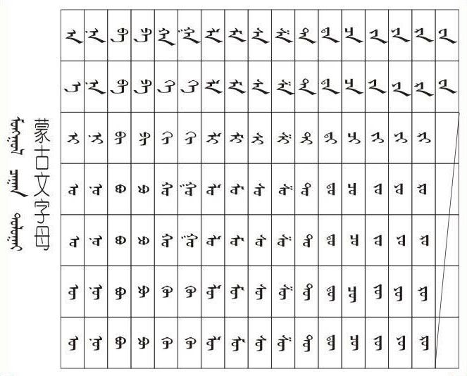 回鶻式蒙古文字是一種拼音文字。字母分元音和輔音兩大類,雖然至今人們尚未在文獻記載中發(fā)現其字母表,但據后人對這種文字材料進行分析,歸納出有19個字母。其中,5個表示元音,14個表示輔音。書寫時元音字母和輔音字母筆畫連在一起,形成一個整體蒙古字。每個字母視其出現在詞里的位置不同,寫法略有變化,分詞首、詞中、詞末3種變體。阿拼寫時一般以詞為單位,上下連書。字序從上到下,行序從左到右。因其是以回鶻文為基礎創(chuàng)建的,因此稱其為回鶻式蒙古文。