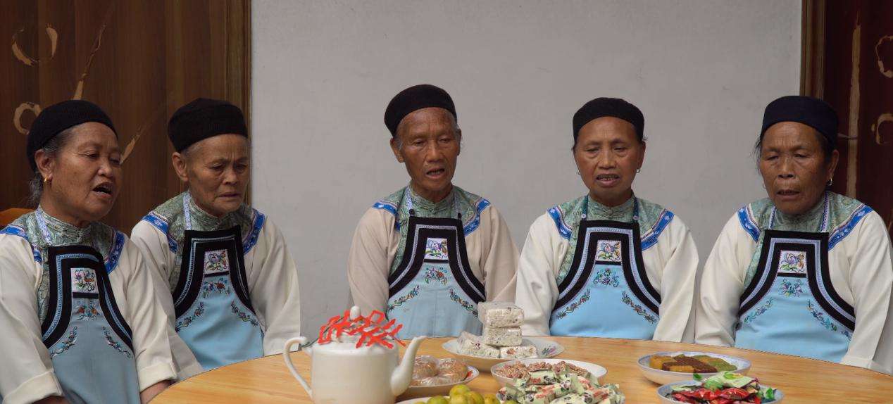 紅星村村內(nèi)布依族村民保留有布依族傳統(tǒng)服飾,在日常生活中也還有穿著布依族服飾的習(xí)慣。紅星村布依族女性服飾做工精細(xì),款式多樣。老人頭戴黑色圓帽,上身主要穿著灰白色斜襟上衣和青藍(lán)色打底的圍腰,上衣領(lǐng)口至兩肩處繡有大面積花紋圖案,圍腰上部也繡有花紋圖案作為裝飾。圍腰上的兩條絲帶系于身后,絲帶上繡有花紋圖案。下身穿著灰色長褲。