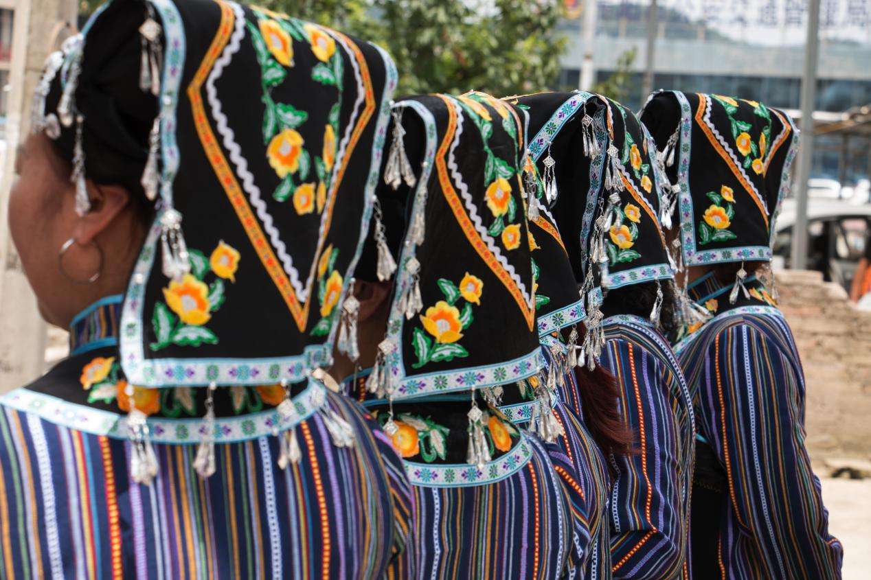 沙坡村布依族女性的傳統(tǒng)服為,頭戴黑色打底的方巾,方巾上繡有大面積花圖案作為裝飾,在方巾周邊還繡有花邊,花邊處串連有銀飾作為裝飾。上身主要為黑色打底的條紋對襟衣和圍腰,上衣肩頸處繡有花朵圖案,圍腰上部也繡有大面積花草圖案,兩袖袖口處同樣也繡有花草圖案。下身則以黑色打底的百褶裙為主,百褶裙底部繡有條紋圖案?! ?/p>