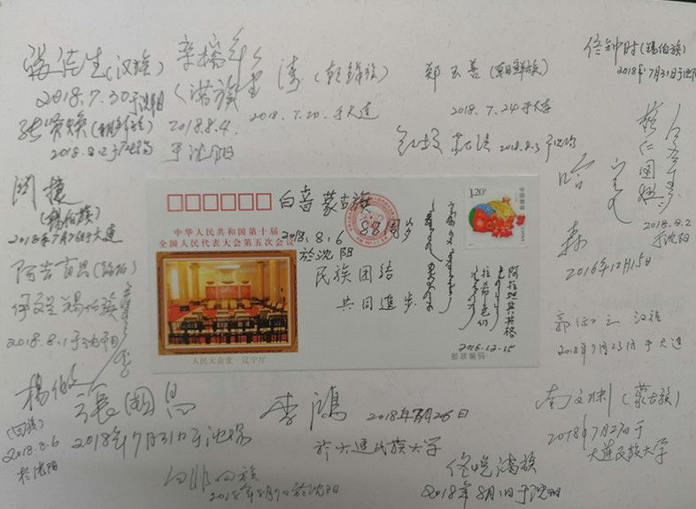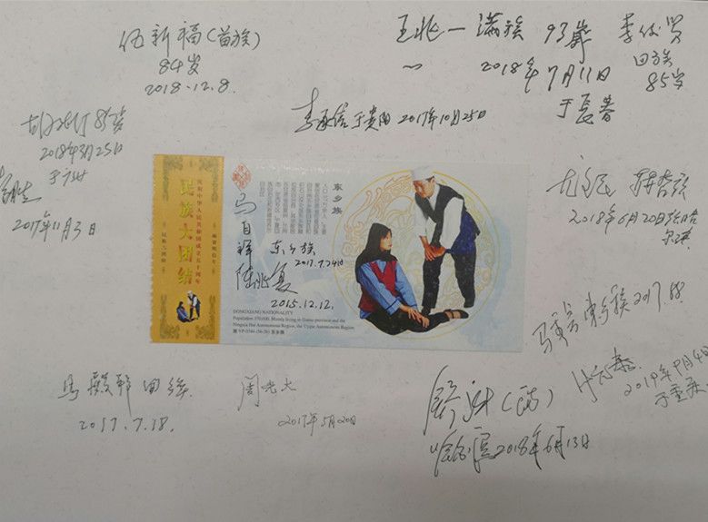 在采集口述影像錄音資料的同時(shí),項(xiàng)目組還收集了大量的珍貴歷史照片以及相關(guān)文物。值得一提的是,他們?cè)O(shè)計(jì)了一種非常有特色的受訪者簽名簿,中間貼著繪有56個(gè)民族的音樂(lè)舞蹈圖案的首日封或明信片,四周簽上受訪者的人名簽名字、民族特征,有些還用民族文字書(shū)寫(xiě),體現(xiàn)了中華各民族團(tuán)結(jié)在一起的精神風(fēng)貌。簽名簿有厚厚的幾大本,設(shè)計(jì)精美,承載著民族工作口述史資源采集的經(jīng)歷,具有豐富的文化內(nèi)涵和博物館收藏價(jià)值。
