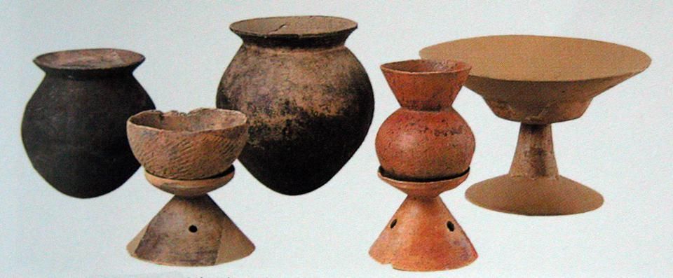 彌生時代的名稱,源自1884年東京市本鄉(xiāng)彌生町“彌生陶器”的發(fā)現(xiàn)。彌生陶器與繩紋陶器截然不同,為素面,灰色。日本人認(rèn)為彌生陶器是“渡來人”制造的?!岸蓙砣恕笔侵袊箨懲ㄟ^朝鮮半島而來,他們帶來了陶器的制作技術(shù)。彌生陶器為深釜器,以甕形器、缽形器、高腳杯(豆形器)為主(圖五)。