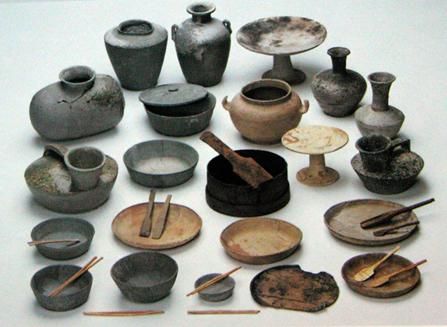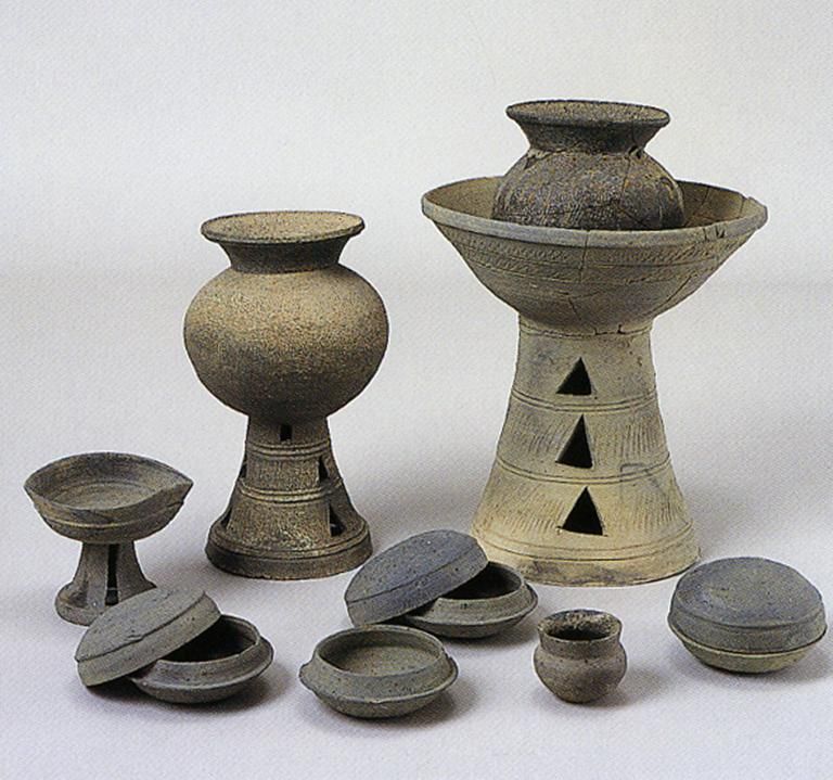 古墳時期另一種陶器為須惠器(圖十二),比土師器精美。它在古墳時代中期才從大陸引進而來,由朝鮮半島的“陶部”工人在相對集中的場所制作,采用輪制技術(shù),器物呈青灰色,器形富于變化,主要為壺、瓶、盤、碗和高腳杯等。