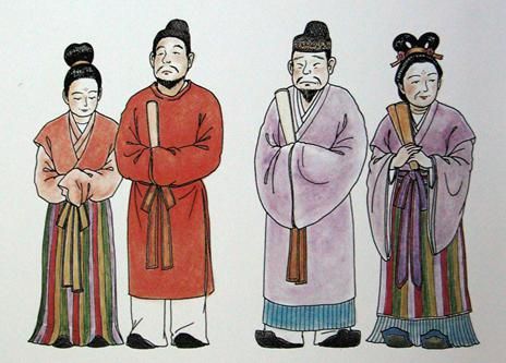 平城京內(nèi)人們所穿的衣服,和唐代服裝也一樣,男子為圓領(lǐng)袍衫,女子為間色裙。唐代因布匹幅面較窄,一條裙子用不同顏色布匹拼接而成,顧名間色裙,一般用六幅制成。腳穿木屐(圖二十三)。