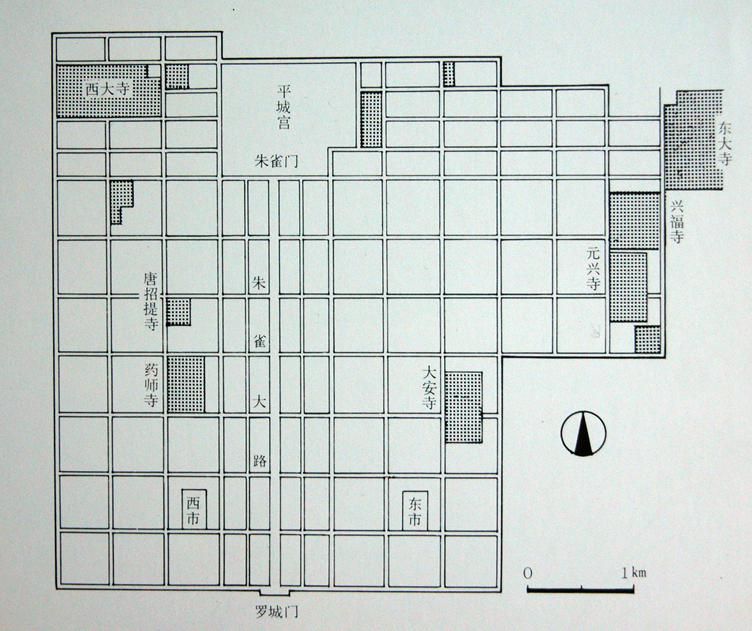 平城京在規(guī)模上繼承了藤原京,面積大致相同,東西約5.9km、南北約4.8km,其形制主要模仿唐長安城。全城平而呈長方形,宮城在北部中央。南面正中設(shè)象征性的都城正門——羅城門。羅城門與宮城的朱雀門相對,朱雀大路縱貫?zāi)媳保L約3.8km,寬72m。而此朱雀大路正好將全城分為東西兩部分,分別稱左京和右京。京城內(nèi)有里坊與商市(即東市和西市)。這些設(shè)置和街道的名稱都和唐長安一模一樣,但總體面積僅為唐長安城的四分之一(圖二十一)。