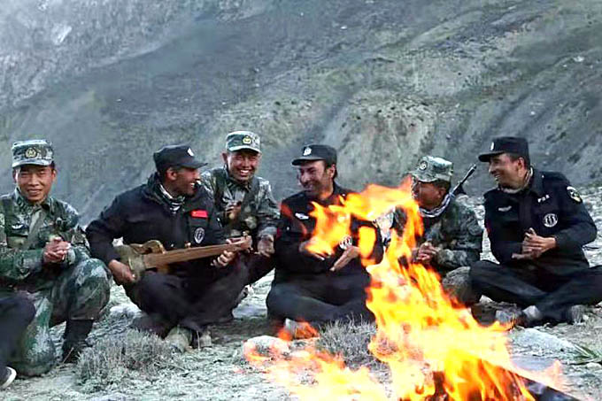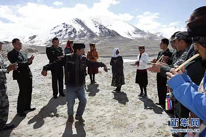 拉齊尼·巴依卡和邊防戰(zhàn)士一起與當?shù)啬撩袢罕娐?lián)歡。(新華社記者 李翔 攝影)
