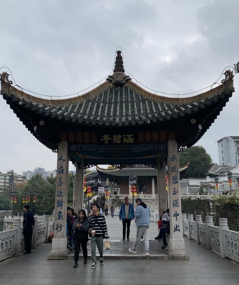 第二部分是甲秀樓。甲秀樓為三層三重檐四角攢尖頂穿斗式木結(jié)構(gòu)建筑,面闊三間,高約22.9米,紅欞雕窗,朱梁碧瓦,白石巨柱托檐,雕花石欄相護。甲秀樓歷來為文人墨客雅集之處,留下碑記、丹青、詩聯(lián)甚多,其中以清代田雯《重修甲秀樓碑記》、畫家鄒一桂《山水覌我圖冊—涵碧潭》、楹聯(lián)大家劉韞良《甲秀樓長聯(lián)》最具代表。